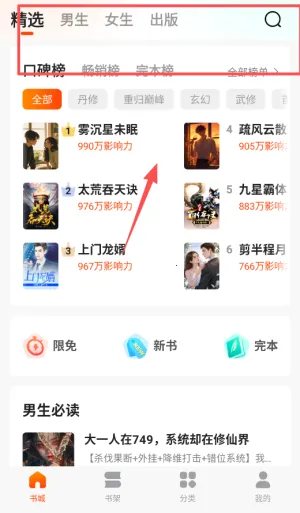 1、安装后打开软件首先进入书城页面,这里按分类推荐了海量小说,你可以直接浏览或使用顶部搜索框查找特定作品。