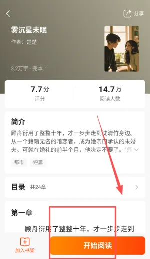 2、找到想读的小说后点击封面进入详情页,简要浏览简介后点击中间的“开始阅读”按钮即可立即进入阅读界面。