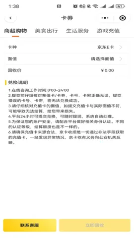 卡券种类丰富,涵盖商超、出行、电商、餐饮等各类卡券,业务范围囊括300多种卡券回收业务,能满足不同用户手中各类闲置卡券的回收需求,无论是常见的京东E卡,还是加油卡等都能回收。
