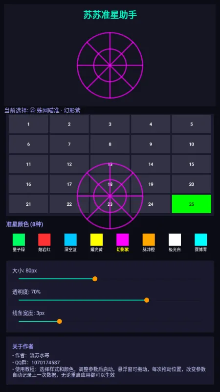 苏苏准星助手是专为FPS玩家打造的专业准星辅助工具,适配各类游戏。支持准星样式、颜色、大小及透明度全维度自定义,通过简单步骤即可完成设置,仅用悬浮框权限,不修改游戏数据,不会导致封号。