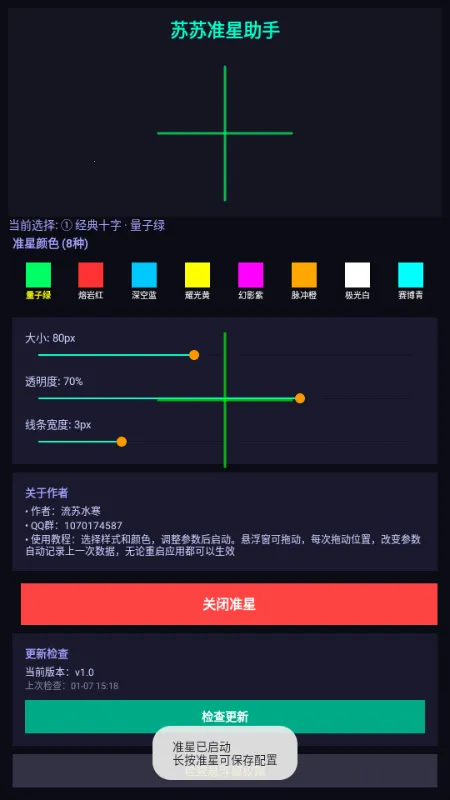 4、使用便捷:操作流程简单易懂,如进入软件点击开启准星,选择样式、调整参数即可顺利使用,悬浮窗还可拖动,位置改变后参数自动记录,重启应用也能生效。