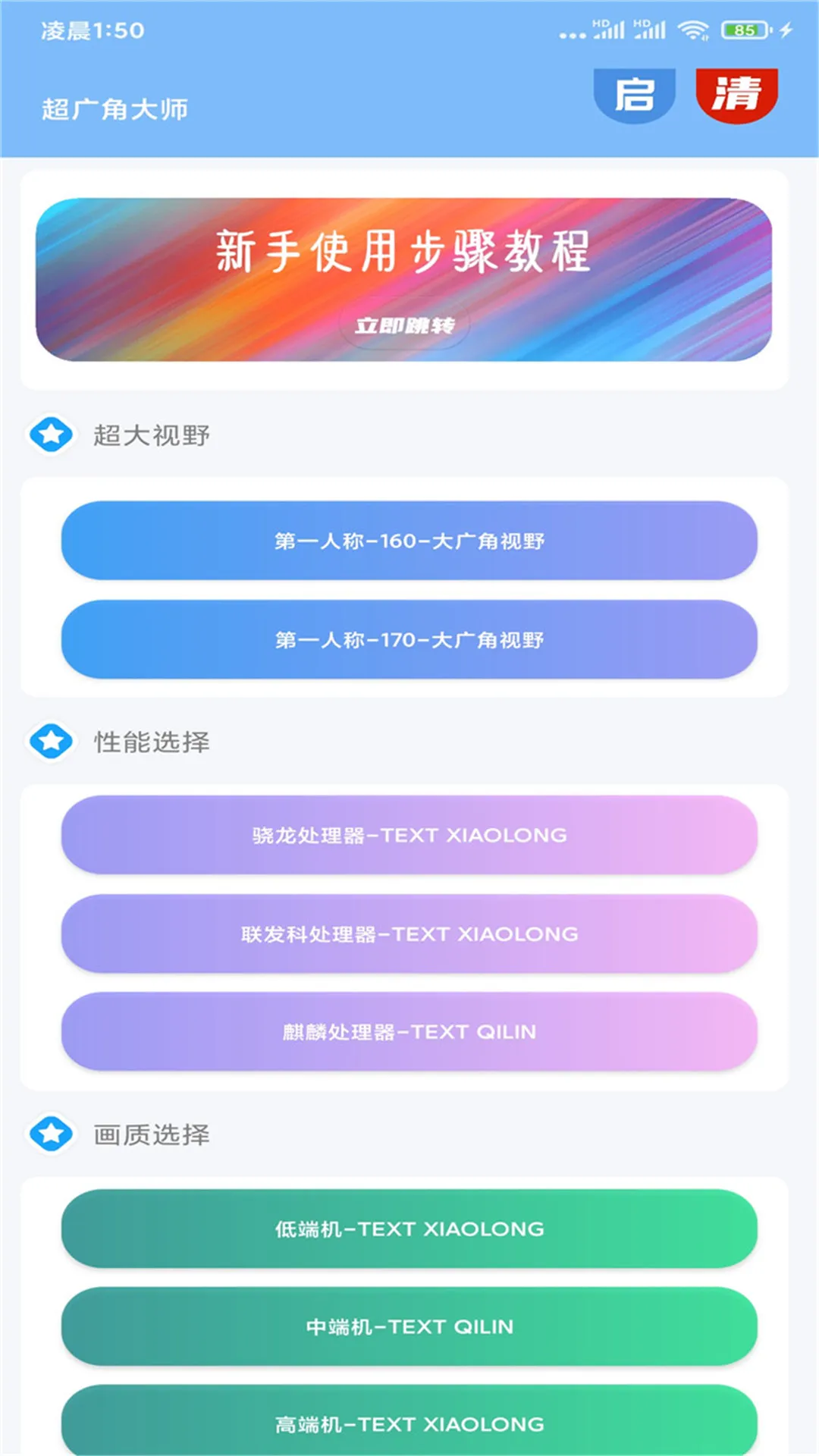 超广角大师最新手机版是吃鸡手游画质优化工具,无需root。有160度和170度超大广角,可自定义视角、画面比例等,能一键调节画质帧率,免费无广告,安全绿色,适配多机型,助玩家畅享流畅游戏。