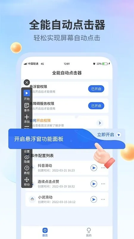 全能自动点击器是一款适用于 Android7.0 及以上系统的手机工具软件。支持点击、滑动等多种操作,可自动创建脚本、录制,有启动暂停等功能。能个性化设置参数,保存脚本,还助障碍人士提高手机使用效率 。