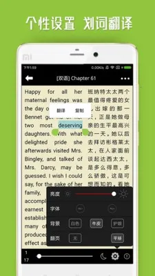 “中英文双语小说最新手机版”是一款高质量的中英双语阅读软件。它拥有大量小说资源,方便用户及时观看,能让用户更高效地学习英语,实用性超强。软件提供真人发音及翻译功能,助用户更好阅读,阅读中可自由切换。其阅读界面有助于理解复杂句子结构和生僻词汇,通过语境加深单词用法记忆,提高翻译技能。点击单词可弹出详细信息,还能根据阅读记录智能推送学习内容。它有方便的搜索和分类功能,书签功能实用。拥有1000多本中英文经典双语小说,支持双语阅读、有声阅读,读英语有多种方式且可自由切换。界面简洁大方,操作流畅,体验极佳,支持离线下载、多设备同步等,是个好用的英语阅读平台。 怎么样,是一款不可多得的学习阅读软件。英文:"The latest mobile version of the Chinese-English Bilingual Novels" is a high-quality Chinese-English bilingual reading software. It has a large number of novel resources, facilitating users to watch in a timely manner, enabling users to learn English more efficiently, and its practicality is extremely strong. The software provides real-person pronunciation and translation functions to help users read better, and they can freely switch during reading. Its reading interface helps to understand complex sentence structures and unfamiliar words, deepen the memory of word usage through context, and improve translation skills. Clicking on a word can pop up detailed information, and it can also intelligently push learning content based on reading records. It has convenient search and classification functions, and the bookmark function is practical. It has more than 1,000 classic Chinese-English bilingual novels, supports bilingual reading and audiobook reading, and there are multiple ways to read English and can be freely switched. The interface is simple and generous, the operation is smooth, the experience is excellent, it supports offline download, multi-device synchronization, etc., and it is a useful English reading platform. How about it? It is a rare learning and reading software.
