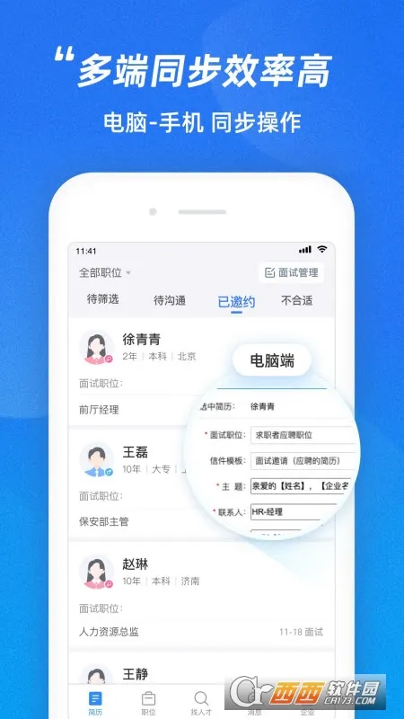 精准匹配大数据推荐,为您快速找到符合要求的人才,海量简历库便捷查找,让招聘更高效。同时,能方便地管理应聘简历,进行邀请面试等操作,让招聘流程轻松搞定。