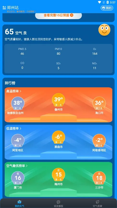 **融合多种权威数据源**:通过大数据算法精准预报天气,定位精准,数据分钟级更新,覆盖范围广,每公里天气都能精准预报。除了提供实时天气、未来15天天气变化等常规信息,还有空气质量指标等。