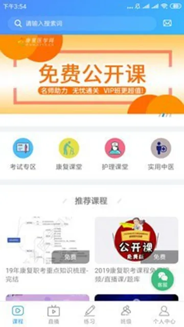 康复课堂是康复医学网学习平台,涵盖康复护理、中医、产后、儿童运动等课程。有录播、直播课程,具备题库功能、资讯功能等,课程免费,分类全,能一键搜索,每日更新考试信息,助用户高效吸收专业知识。