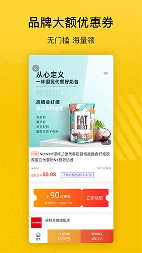 1 海量优惠券:90%的商品都有券,每天5000多万张优惠券实时更新,还有上万家知名品牌的额外优惠券任意领。