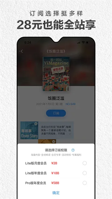 想知道第一财经杂志一年多少钱?第一财经杂志APP能解决你的问题。它是一款超棒的电子财经资讯应用,涵盖各类财经期刊信息。这里有金融、财经、市场趋势、国情动态等资讯,助你在商业金融中发现机遇。每月一期的频率,减轻阅读负担。它有崭新视觉设计,界面炫酷,阅读停不下来。还有电视广播文字全天候全维度直播,1500位记者编辑提供及时独家的财经资讯。社交网络全涵盖,能自由分享。自选股设置便捷,正文关联沪深个股可随时关注。订阅方式简单,启动APP完成注册登录后,在阅读页面挑选想订阅的期刊,进入期刊界面点按订阅开通对应会员服务,就能获取全部数字期刊阅读权限及课程音频内容收听资格。Lite版月度订阅28元/月,Lite版年度订阅188元/年,Pro版年度订阅588元/年,价格多样任你选。