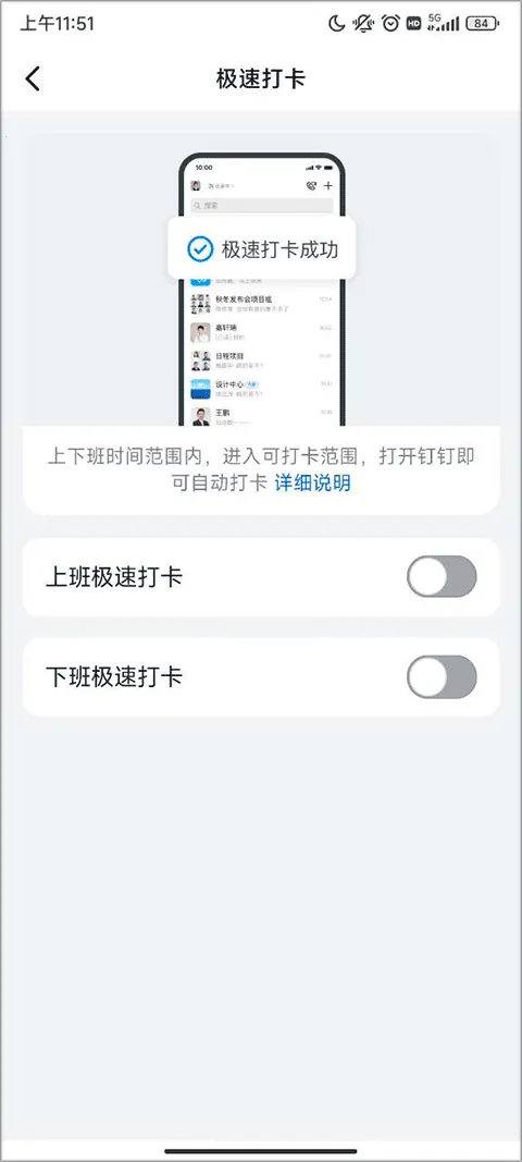 4、进入到极速打卡界面之后,把上班极速打卡和下班极速打卡后面的按钮打开即可。