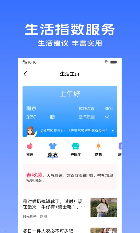 vivo天气预报是vivo手机自带软件,支持vivoiQOO等品牌。能定时报当天天气气温,恶劣天气提前推送。有多种生活功能,提供简约7日预报等,支持方言播报,数据权威,可防气象灾害,方便出行规划。