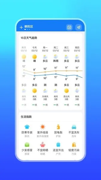 贴心指数,生活便利:提供非常贴心的生活指数建议提示信息,能为用户带来很多实用性的生活建议,让生活更便利。