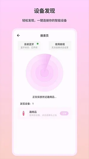 趣芯是一款智能趣用品控制软件,支持蓝牙连接,能轻松发现并控制各类趣用品。提供一键连接、设备发现等功能,还有多种设备控制模式。支持远程互动,让用户享受全新体验,随心畅玩,感受宇宙乐趣。