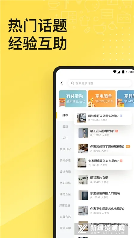 活跃家居社区,不管你关注的是高大上的国内外家居创意,还是生活琐碎,这里都能满足你。大家一起嬉笑怒骂,分享居家生活的酸甜苦辣,还能在热门话题讨论中互助,获取装修经验。