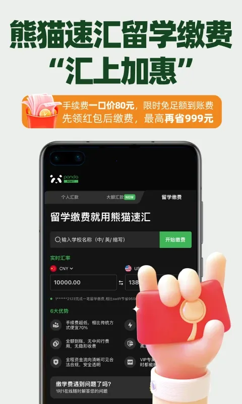 费用超划算:相比传统汇款渠道高额手续费,熊猫速汇仅为其十分之一,大大减轻跨境汇款负担。