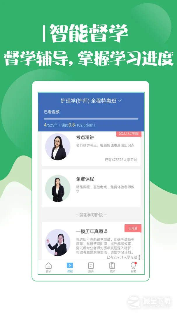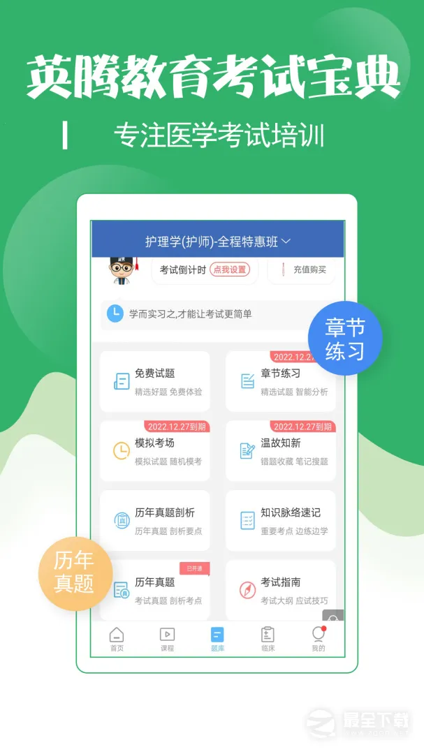 如果你正在备考初级护师考试,那这款软件绝对是你的得力助手!它能为你提供全方位的学习支持。这里有海量的学习资源,涵盖护理知识各个方面,精准剖析考点,让你轻松掌握重点。课程由北京主任医师悉心授课,以15分钟左右短视频形式精辟教学,助你轻松掌握核心考点,解决高频错题。软件还提供教学练评考一体化的智能学习平台,电脑、手机、平板多终端同步学习,方便你随时随地学习。英腾200亿专业大数据分析,精编1 - 3套考前密卷,考场模拟自由组卷,准确点题。更有专业一对一督学,附赠考前冲刺特训、智能学习测评等超值服务。能为你量身定制学习计划,定期测试评估,查缺补漏,全程智能督学,让你每月都能看到进步。有了它,备考初级护师考试变得更简单、高效,赶紧下载试试吧!