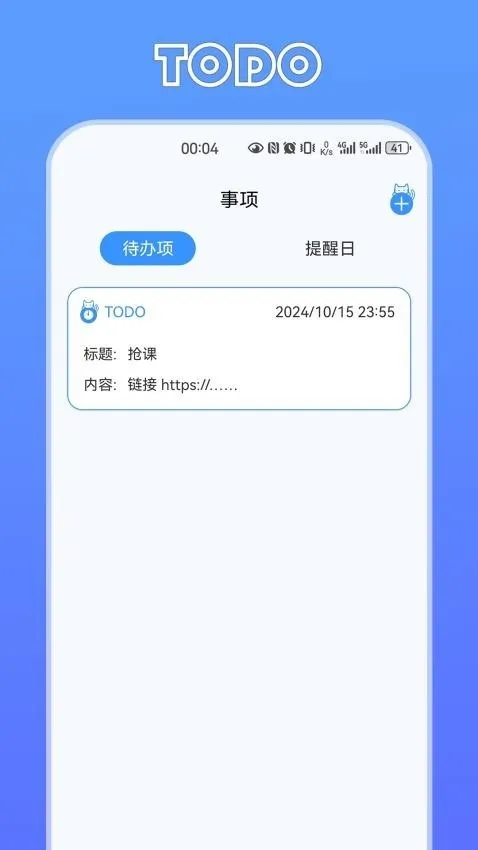 定时猫App是功能强大的时间管理软件。有定时锁屏、专注模式、事项提醒、倒数日等功能,能助用户科学规划日程,提升执行效率。适用于学习、办公、生活等场景,界面简洁,还有智能算法推荐等特色。