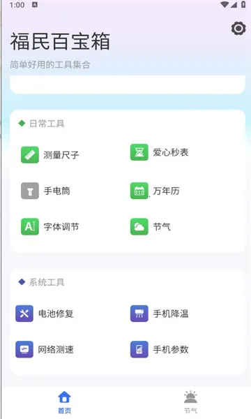 福民百宝箱是一款系统工具类手机软件,功能齐全,涵盖多种实用工具,操作简单,无广告干扰。能解决各种问题,提供多种壁纸风格,还有成语知识等。具备让手机更实用、保护隐私、清理垃圾等特色,新版本可快速清理、管理手机。