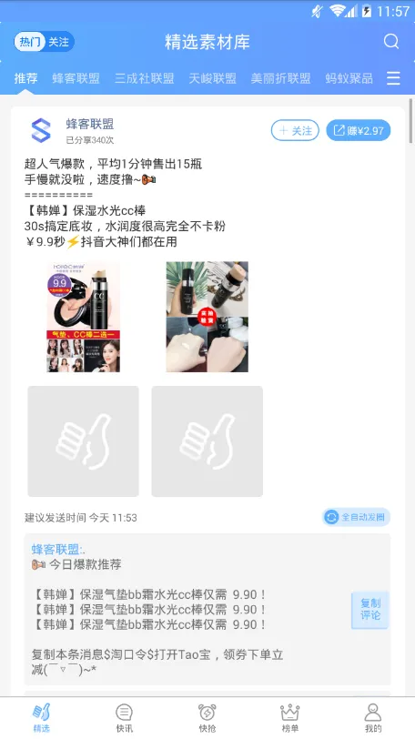 它的功能超强大。“快抢”提前选好爆款,搭配超多实拍素材,助力社群活跃,轻松预热宣传,定点引爆秒杀。“榜单”用数据说话,实时显示上榜好物数据及各品类全天销量TOP100。“精选”全网各大联盟朋友圈文案,一键关注喜欢的联盟,轻松分享商品与文案,解决找好物和文案的难题。“快讯”网罗科技圈实时资讯,解读官方动态新规玩法。有了好单库,购物更便捷,资讯更及时,轻松满足你的各种需求,赶紧来体验吧!