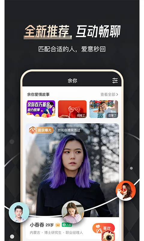 余你婚恋是一款相亲社交软件,玩法多样。采用面具模式,只聊心灵三观;有兴趣标签助找对象;聊天可考察。还有真人认证、三观问答等功能,帮用户屏蔽干扰,精准匹配,轻松脱单。