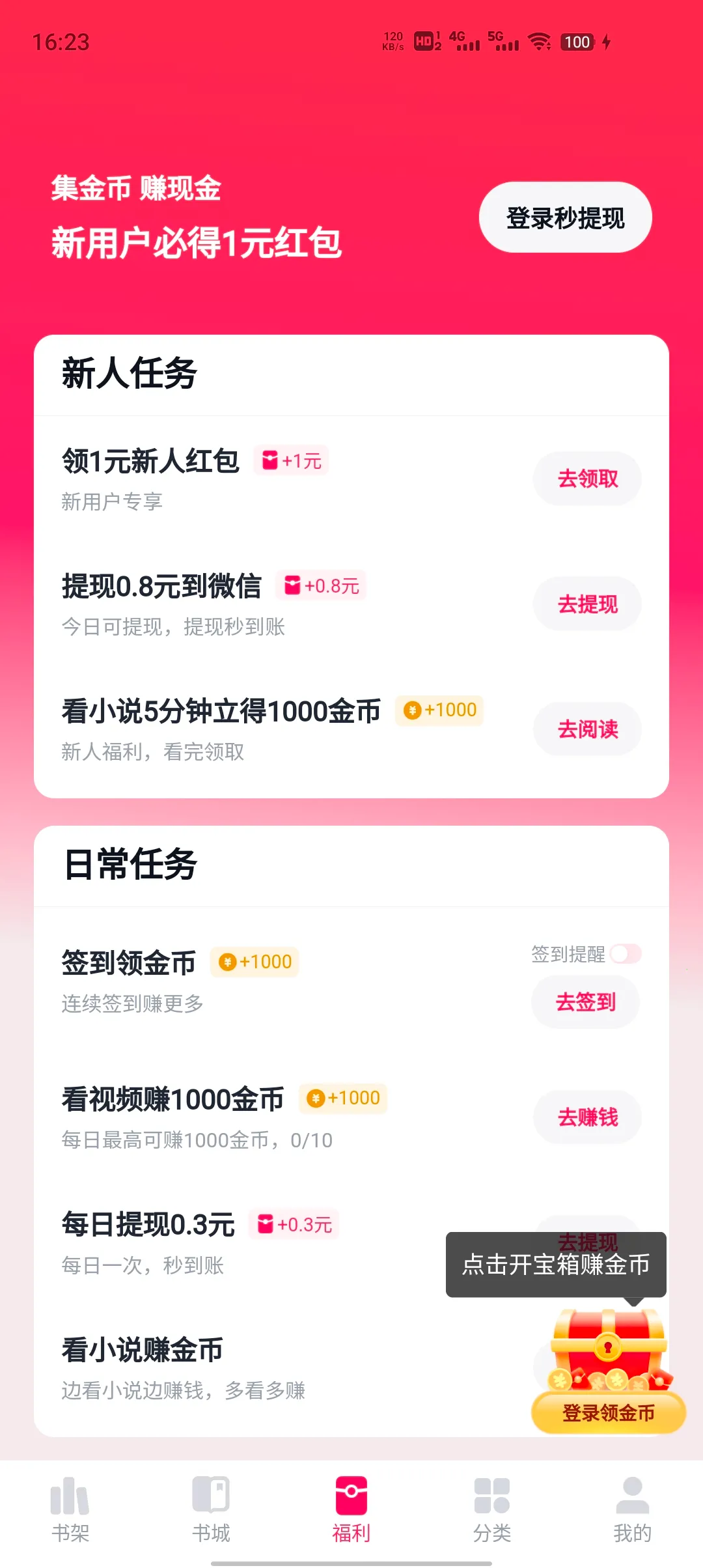 任务中心在线阅读能得金币,金币可转零钱,免费看书还能赚钱,新用户有现金红包,签到阅读也能赚大量金币且提现秒到账。