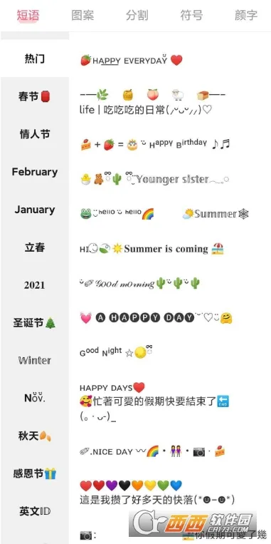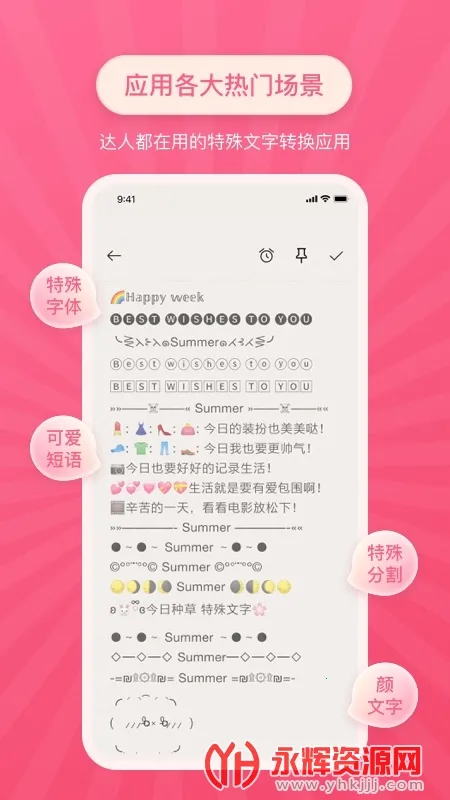 特殊文字类软件能满足你对文字个性化的需求。它有丰富多样的字体库,像时尚艺术手写等各种风格,让文字生动有趣。集成超多特殊符号和表情,还有大量花式短语、颜文字等,能让你的文案每天不重样。支持丰富文字样式转换,比如个性字体、花体字、空心字等。操作界面简洁易懂,无需复杂学习就能快速上手。兼容多个平台,可复制粘贴到社交媒体、短视频水印制作等多种应用场景。生成的特殊字体识别度高,能提升内容视觉吸引力。支持即时预览,修改样式时实时看到结果,调整更直观。还提供大量内置模板样式,节省时间,提高创作效率。无论是聊天交友还是发文发帖,用它都能让你的文字与众不同,交流更有趣。