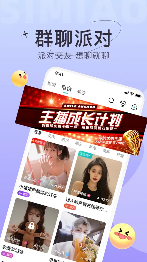 多种功能满足社交:涵盖实时通话、邂逅搭讪、主题电台、声音名片、动态广场等功能。像动态广场可记录生活瞬间,扩列好友处cp;主题电台每天新主题,告别孤独。
