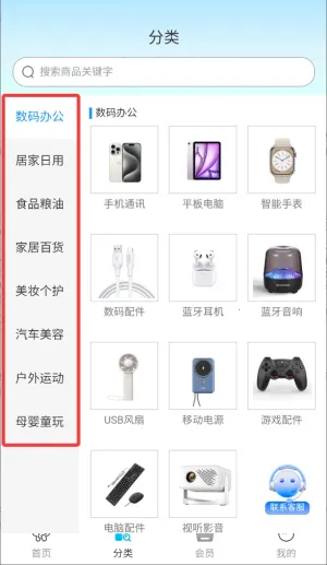 2、在主页面选择"分类"功能入口,浏览各类商品的详细分类列表。