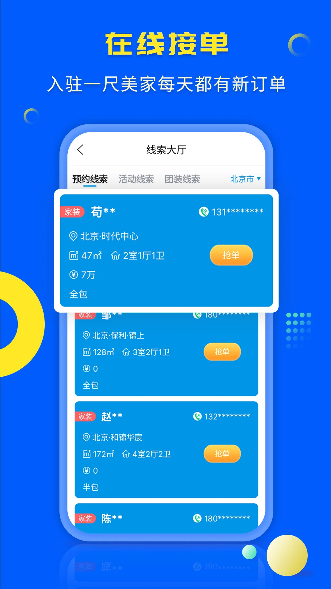 一尺美家接单平台超棒的!它能为有装修需求的用户提供一站式新房装修服务。这里装修案例丰富,涵盖各种风格,户型面积多样,还有海量高清实景图片及视频供参考,帮你轻松找到适合自家的装修灵感。平台免费提供3套订制设计方案,3家对比,能选出最适合自己的。还免费上门量房,提供3家报价材料清单,方便对比选性价比高的。有同城口碑服务商排名,助你找到优质服务。各种装修知识、家居知识、风水知识、省钱知识等一应俱全。对于装修公司来说,平台提供线上报价、订单管理、客户管理等功能,让工作更高效。总之,一尺美家接单平台无论是对业主还是装修公司,都能极大地满足需求,带来便利,是装修的得力助手。