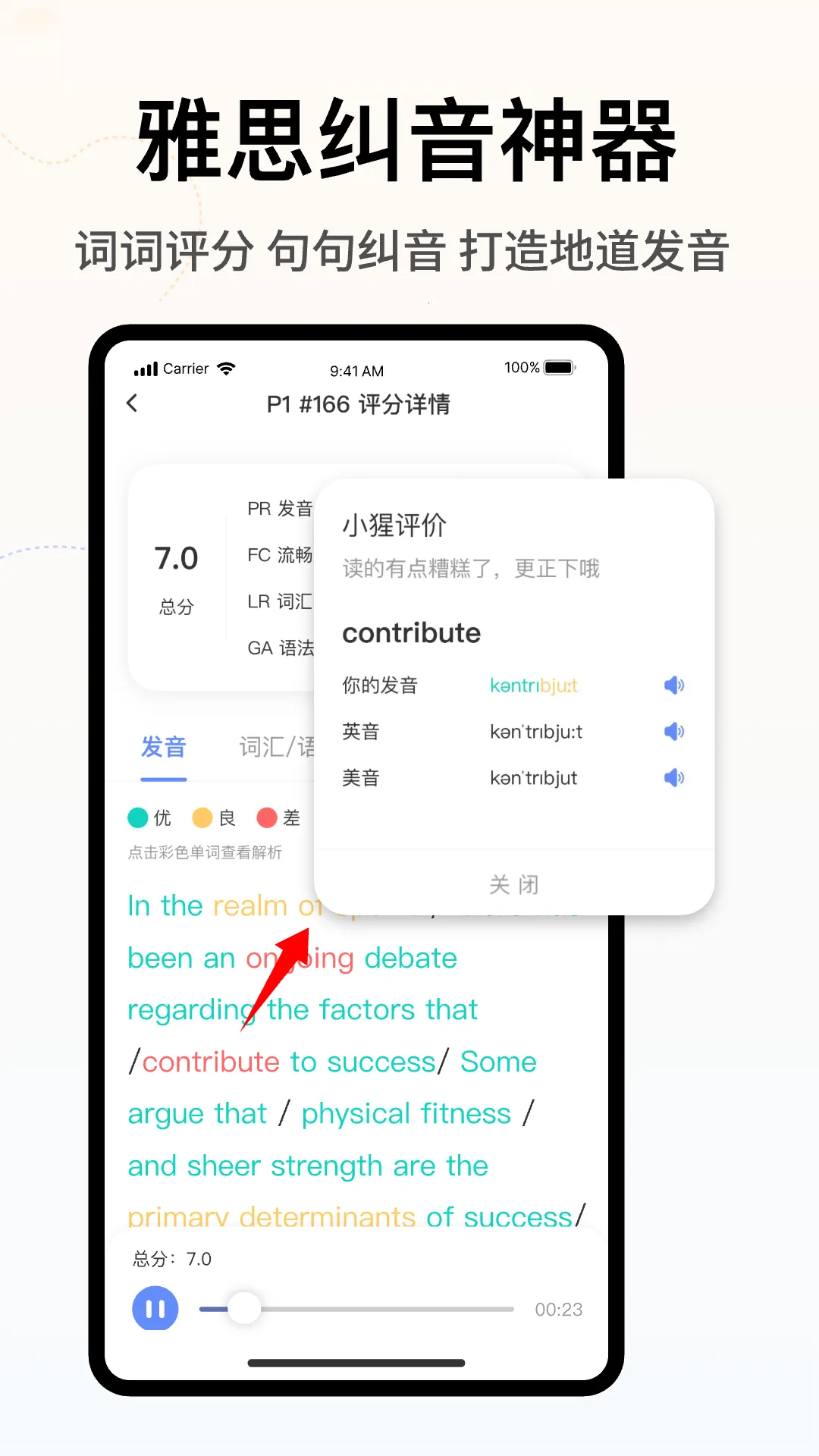 AI评分系统强大,猩际自研AI评分,智能纠正发音、识别语法用词错误,附详细批改解析。