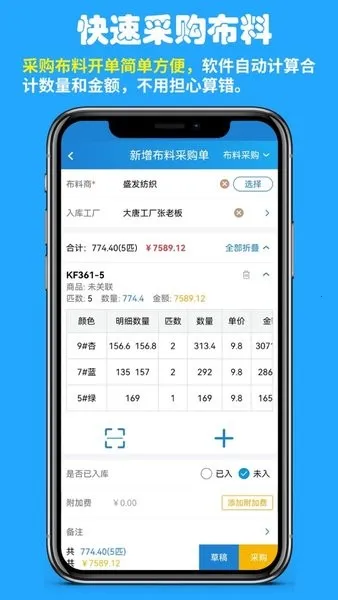 快售工厂安卓版是广州衣迅信息科技研发的服装行业数据化管理软件。为服装企业提供生产管理方案,含布料采购、裁床出货等功能,界面简洁易上手,受广泛好评,v1.2.52727a893版本优化部分功能。