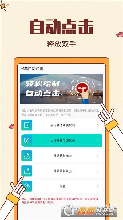 屏幕自动点击器是一款超实用的工具!它专业轻量还免root,能精准模拟触控。无需复杂配置,就能自定义点击位置、间隔时长、循环次数和滑动轨迹,让手机操作自动起来,彻底解放双手。