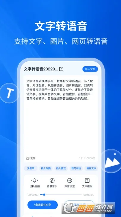 文字转语音助手2026最新版本由上海互盾信息科技有限公司开发。界面简洁操作便捷,能轻松将文本转MP3,支持自定义语言声音,有多种发音可选,适用于多场景,还具备智能文本识别等功能。