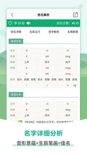 2、精准数据分析:结合姓名汉字大数据,精准解析姓名信息。通过对汉字笔划、字形、字义、音韵等方面的全面分析,以及五行分析、生辰八字测算等,为用户提供全方位准确的取名服务,让名字更符合宝宝的命理。