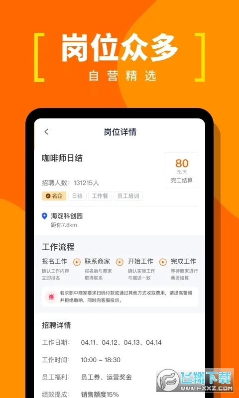 求职流程高效快速:定期清理未招聘岗位,保证报名后1天内联系,3天内上岗,让你快速开启工作之旅。