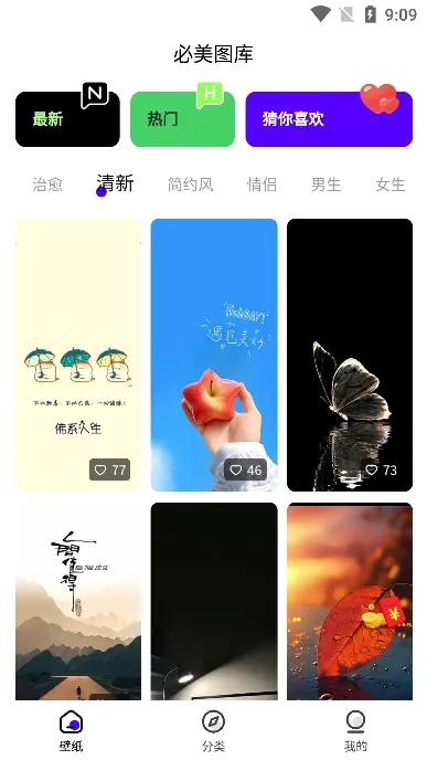 分类细致入微,壁纸按风格分为文字、个性化、简约等多种类型,还有自然风光、动漫、游戏、名人偶像、抽象艺术等,方便用户按喜好快速筛选。