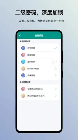 设置密码很简单:先下载安装软件并打开,进入后初步设置密码,输入两次就能进入。在首页点击下方导航栏“发现”,里面有密码设置和随机密码功能,比如点击图案锁,就能设置图案密码、指纹密码、密保问题、第二空间密码等。
