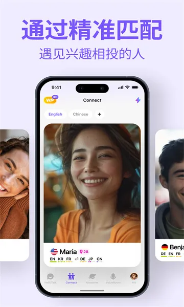 4、匹配精准高效:系统依据用户的母语、目标语、水平等级、年龄、地域等维度智能推荐语伴,也可自主筛选,实现秒级响应无障碍开启对话。