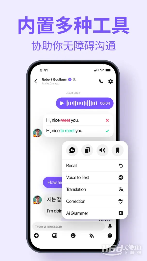 3、智能辅助功能强大:内置一键翻译、即时发音、AI语法纠错等实用功能,边聊边学,降低沟通门槛,提升学习效率。