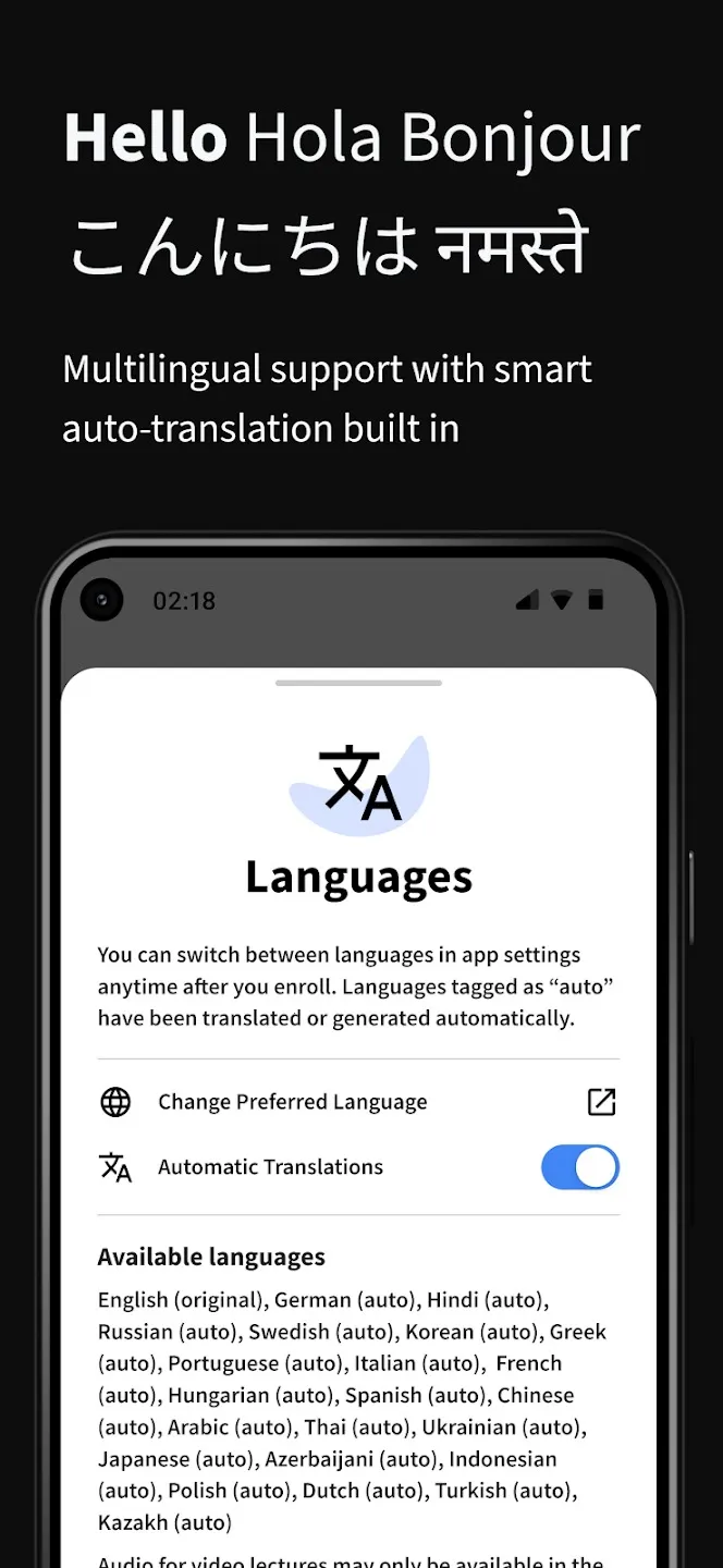 3、语言选择多样:课程覆盖12种语言,包括丰富的英语、汉语、西班牙语、葡萄牙语、法语及俄语资源等,方便不同语言背景的用户依据自身情况选择学习。