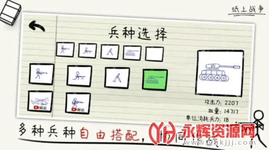 纸上战争是策略战争游戏,玩家扮演指挥官,可选27种部队。有丰富战斗体系与玩法,兵种相克,需合理排兵布阵、调整战略。支持多人联机,画面卡通,关卡丰富,能体验热血刺激的纸上对战 。