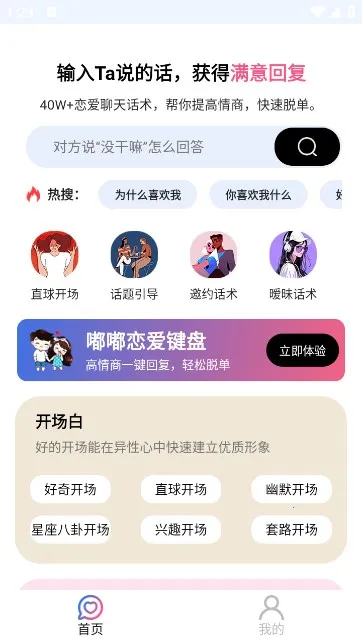 嘟嘟恋爱话术是一款主打聊天回复键盘的专业沟通辅助工具,聚焦解决聊天不会回、怕尴尬、易冷场的核心问题,以轻量高效的方式提供贴合语境的回复建议与接话思路,适配暧昧聊天、相亲沟通、开场破冰、约会邀约等多类高频社交场景,让表达更自然体面,聊天沟通更顺畅。