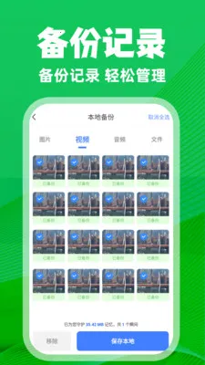 3. 备份记录智能管理:按图片、视频、音频文件分类展示备份记录,支持批量选择移除或重新保存至本地,备份状态一目了然,管理更便捷。