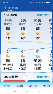 转晴天气最新手机版是一款备受关注的天气应用。它在诸多方面有着出色表现。其界面设计简洁明了,操作十分便捷,能让用户轻松上手。对于日常出行来说,它提供的天气信息非常实用。能精准呈现未来24小时逐小时的天气变化,像风力、紫外线强度等都能实时知晓,下雨时段提前预警,早晚温差也会及时提醒,贴心守护出行。智能城市管理功能很棒,支持自动定位当前城市,一键获取本地天气,操作简单快捷,还能手动添加多个城市,方便随时查看不同地方的气温与晴雨情况。贴心语音播报更是贴心,一键开启后,当日温度、天气预警、穿衣建议、空气质量及未来天气等想听的信息都有。超大友好字体对老年人和视力不便人群很友好,查看轻松。超长40日预报搭配日历功能,提前掌握未来天气,做好出行与生活规划,节日节气天气一目了然,查看直观。总体而言,转晴天气最新手机版是一款很不错的天气应用。