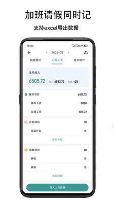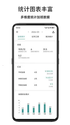 2. 智能算薪:录入工时后可自动核算加班工资与当月总薪资,账目清晰。