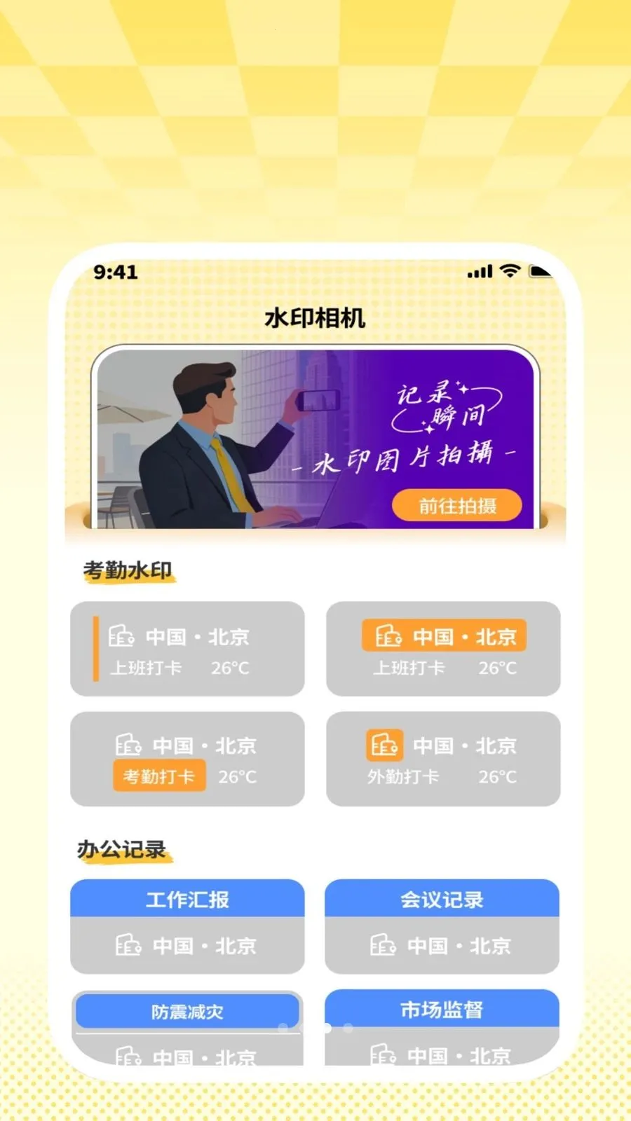 水印相机规范考勤与办公记录。内置多种考勤水印,自动添加相关信息,适配各类办公记录场景,快速拍摄带水印照片,让考勤与办公记录更规范、高效,省心又便捷。