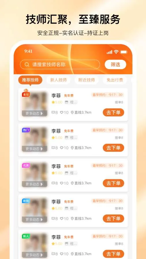 海量技师,高度匹配匹配周边持证技师,可按手法经验评价筛选,轻松找到合适服务者。