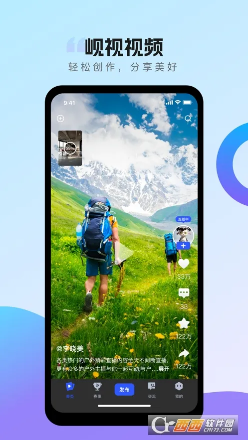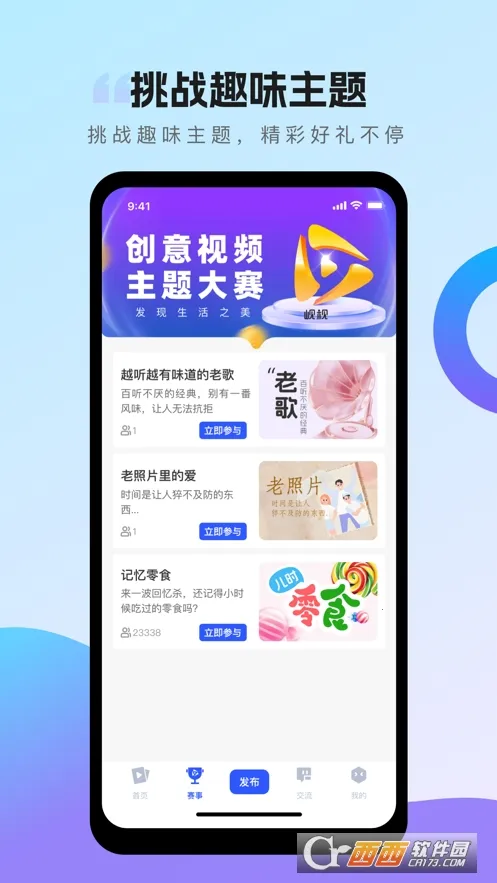 岘视短视频赛事是全民参赛的短视频主题赛,百万现金悬赏。用户上传符合主题作品可参赛瓜分奖金获荣誉,还有超多福利。有美女主播直播,官方赛事商城上线,海量短剧随心看,新版特性优化玩法与体验。