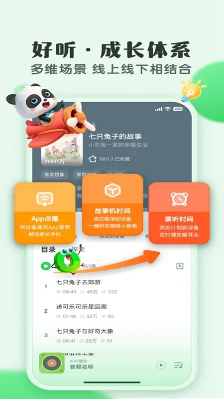 3、方便实用:支持离线收听和定时停止功能,不管是睡前哄睡还是出行陪伴都能满足需求。