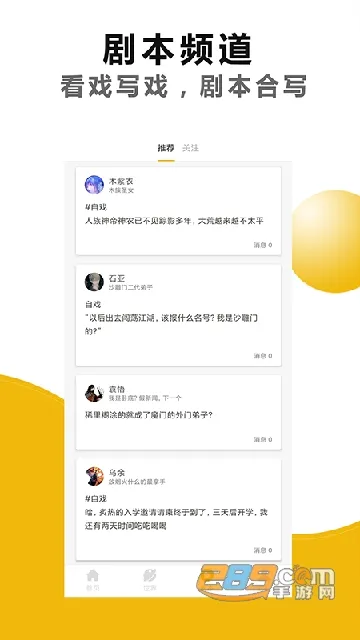 剧本戏是一款语c社交与剧本创作结合的软件。支持在线写戏、编辑创作、分享剧本,有丰富剧组分区和招募活动。用户能多身份对戏交友,还能交流学习,体验多人群戏,满足戏文创作与社交幻想 。